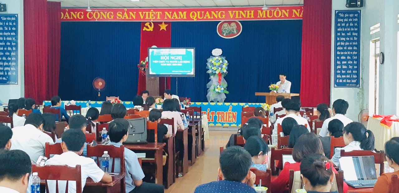 Tại Hội nghị, thầy Hồ Trung Cang, Phó Hiệu trưởng Nhà trường đã thông qua Báo cáo tổng kết thực hiện Nghị quyết năm học 2024-2025. Báo cáo đã tập trung đánh giá toàn diện các mặt hoạt động, từ công tác giảng dạy, học tập, rèn luyện của học sinh đến các phong trào thi đua và hoạt động đoàn thể. Mặc dù đối mặt với nhiều khó khăn, thách thức, tập thể Nhà trường đã đoàn kết, nỗ lực không ngừng để hoàn thành xuất sắc các chỉ tiêu đề ra, góp phần nâng cao chất lượng giáo dục toàn diện và khẳng định vị thế của Nhà trường trên địa bàn tỉnh nhà. Bên cạnh đó, Báo cáo còn thẳng thắn chỉ ra những hạn chế, thiếu sót, những mặt chưa làm được để có hướng khắc phục trong năm học này. Hội nghị đã lắng nghe Phương hướng nhiệm vụ của năm học 2025-2026. Từ đó, Hội nghị đã thảo luận, trao đổi, đề xuất các giải pháp để hoàn thiện, thống nhất, từ đó triển khai hiệu quả cho năm học này. Cũng tại Hội nghị, thầy Lê Cao Nguyên, Phó Hiệu trưởng đã Báo cáo, tổng kết phong trào thi đua, đánh giá công tác thi đua khen thưởng năm học 2024-2025 và phát động phong trào thi đua cho năm học 2025-2026. Toàn thể viên chức, người lao động đã cùng cam kết thi đua, nỗ lực hết mình để thực hiện thắng lợi nhiệm vụ trong năm học sắp tới. Kết thúc hội nghị, 100% viên chức, người lao động đã biểu quyết thông qua Nghị quyết Hội nghị Viên chức, người lao động năm học 2025-2026. Nghị quyết này là kim chỉ nam cho mọi hoạt động của Nhà trường trong thời gian tới.