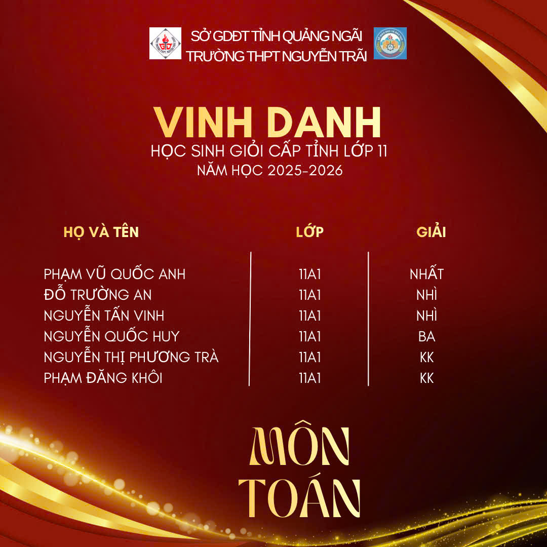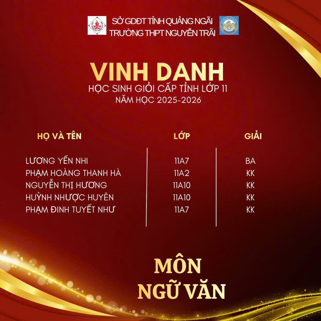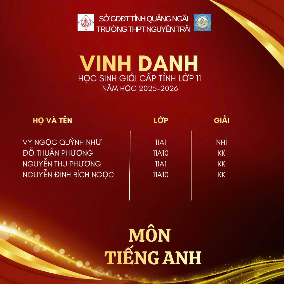 Trường THPT Nguyễn Trãi tiếp tục khẳng định chất lượng giáo dục với những thành tích nổi bật trong kỳ thi học sinh giỏi lớp 11 năm nay. Với sự nỗ lực không ngừng của các em học sinh cùng sự tận tâm, trách nhiệm của đội ngũ giáo viên, nhà trường đã gặt hái được nhiều giải cao ở các môn thi, góp phần nâng cao vị thế và uy tín của trường.