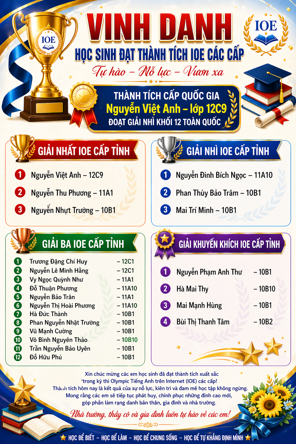 Bên cạnh đó, nhà trường đặc biệt biểu dương em Nguyễn Việt Anh lớp 12C9 đoạt giải Nhì khối 12 toàn quốc và 22 học sinh đã hoàn thành tốt kỳ thi IOE cấp quốc gia. Đây là dấu mốc quan trọng, thể hiện sự nỗ lực bền bỉ, tinh thần học tập nghiêm túc và khả năng hội nhập tiếng Anh ngày càng vững vàng của các em.